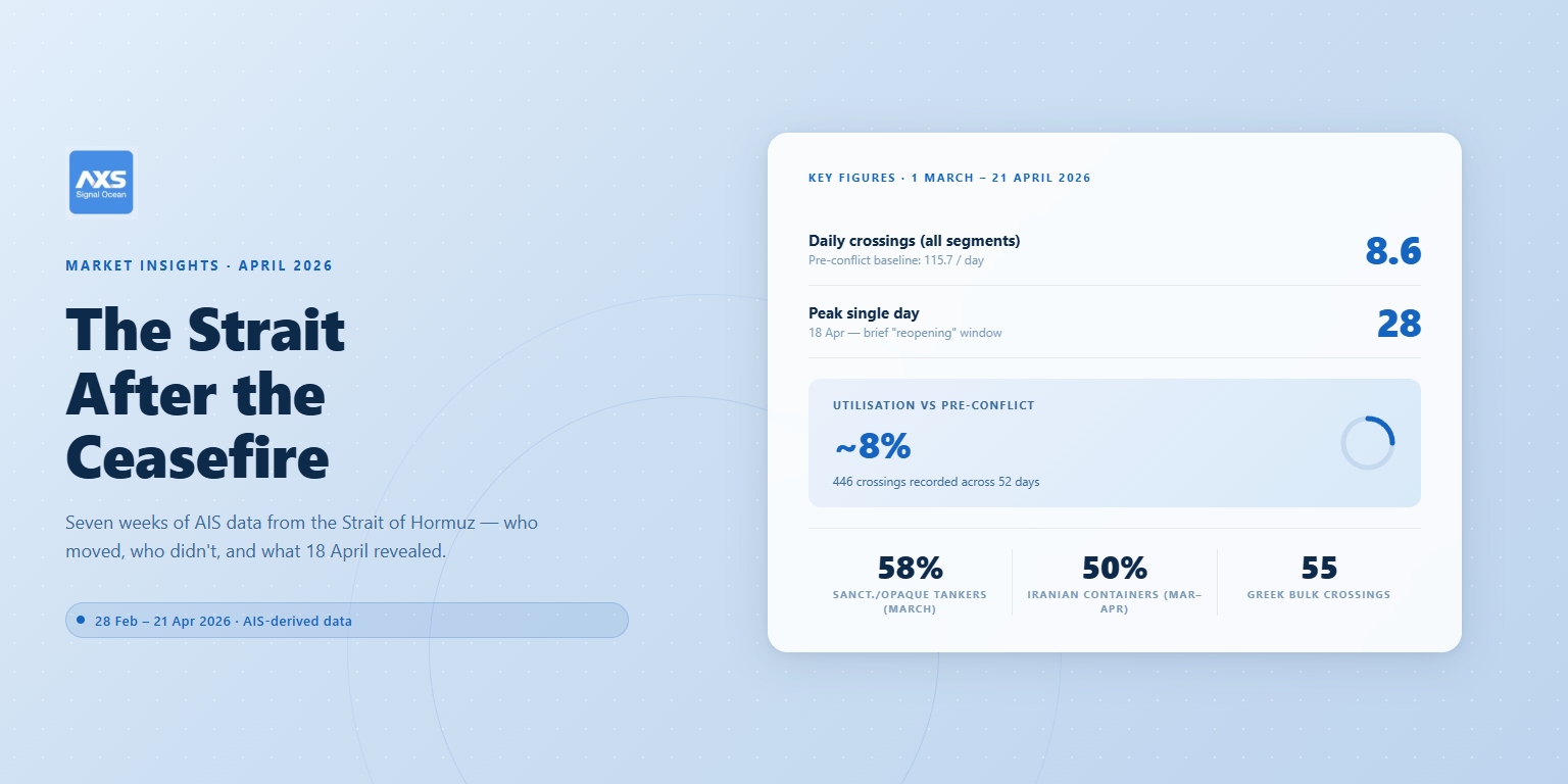 When we published When the Gulf Went Still in early April, the defining feature of the Strait of Hormuz was absence. Crossings had collapsed to near zero in the first days of March. The 353 dry bulk and multipurpose vessels confirmed inside the Gulf by 5 March had nowhere to go. Seven weeks of continuous AIS tracking later, traffic has not recovered in any meaningful sense. What has emerged instead is a stratified corridor: thin, defined less by commercial logic than by risk tolerance, flag of convenience, and proximity to the sanctioned fleet.