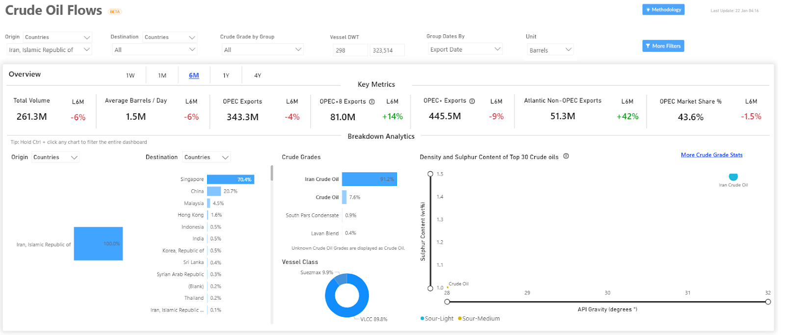 Metrics Description: Trade-flow and vessel-level data based on reported loadings and movements over a six-month lookback period. Destinations reflect reported discharge locations and may include transshipment or storage hubs. Cargo classification by crude grade and vessel class reflects observed movements; month-to-date figures may be affected by reporting lags, discharge timing, and cargo aggregation practices.