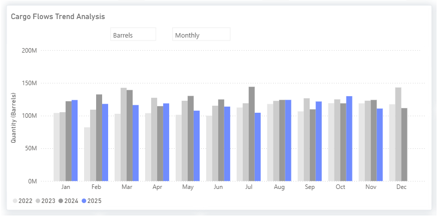 Flows climbed to 129.8 M barrels in October 2025, the strongest monthly level of the year and the culmination of steady growth from August through October. However, early November Voyage Details show a steep pullback, with estimated flows currently approx. 110 M barrels for the end of the current month.