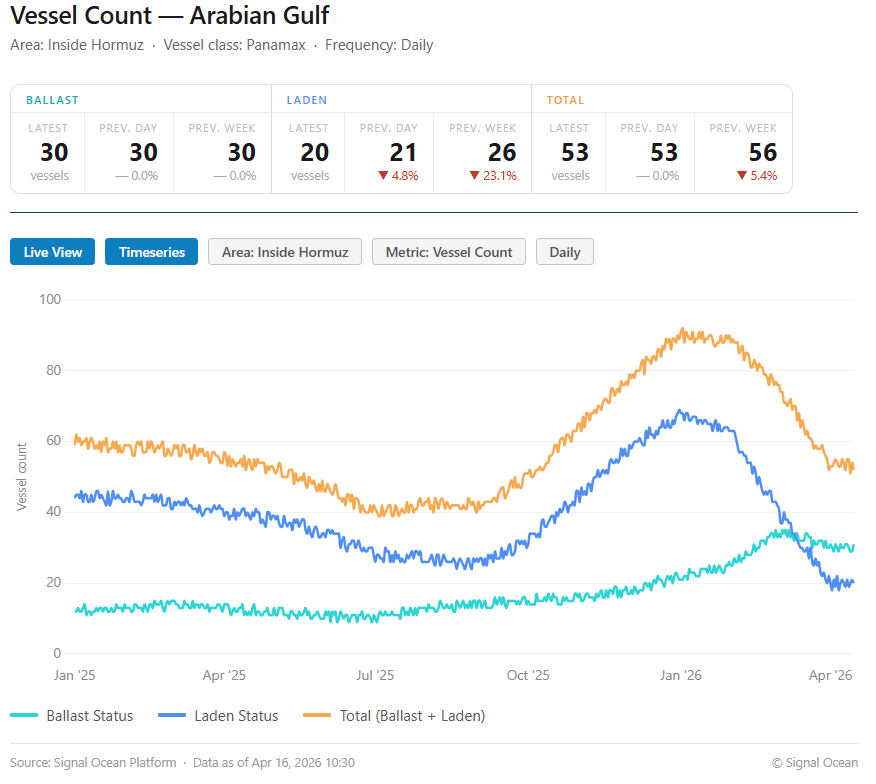 In this context, Signal Ocean data show that the number of Panamax vessels in ballast condition within the Strait has remained stable at around 30 (as shown in the chart below), while laden vessel counts have declined sharply from late-February highs. This divergence points to emerging delays in loading or transit for vessels operating in the region amid ongoing disruptions.