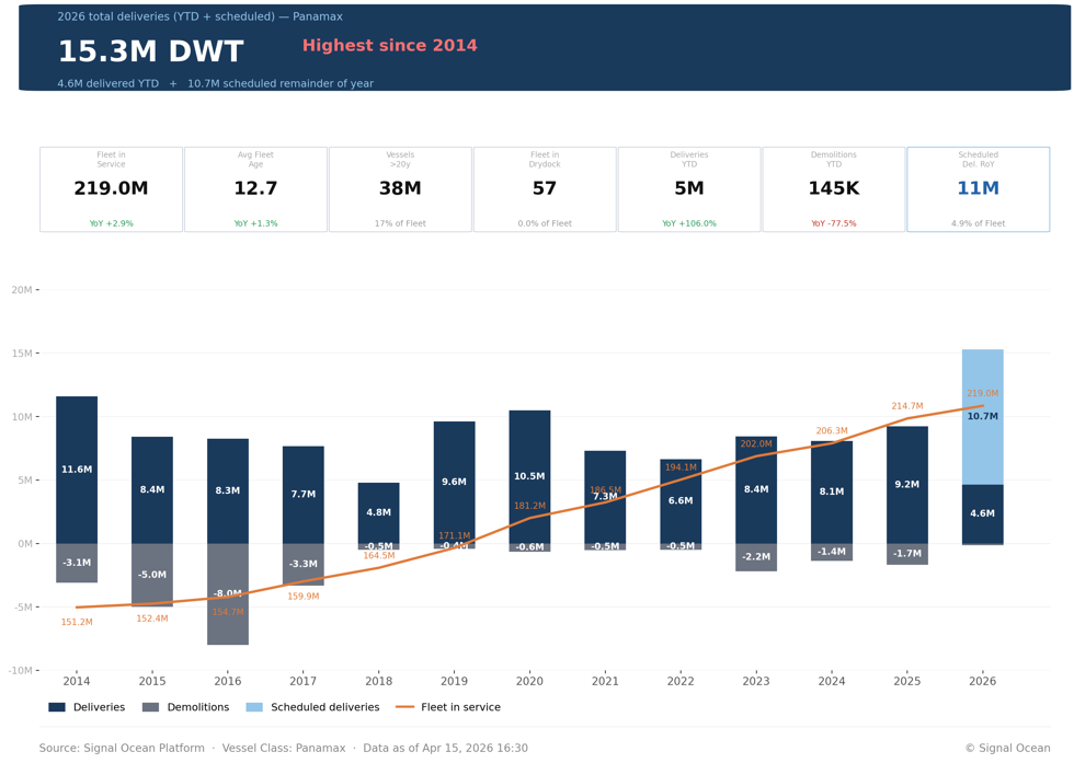 Panamax vessel deliveries are projected to reach a record high in 2026, with approximately 15 million dwt of new capacity entering the market, up from roughly 10–11 million dwt in the prior year. This expansion is expected to push the global dry bulk fleet near 220 million dwt, reinforcing a clear supply-side growth cycle.