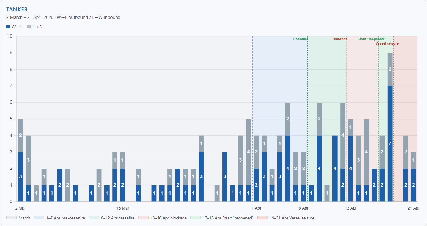 The 18 April data remains the most important single observation: given the signal, the market responded within hours. The question of when normal traffic resumes is entirely political. The commercial infrastructure to support it is already in place.