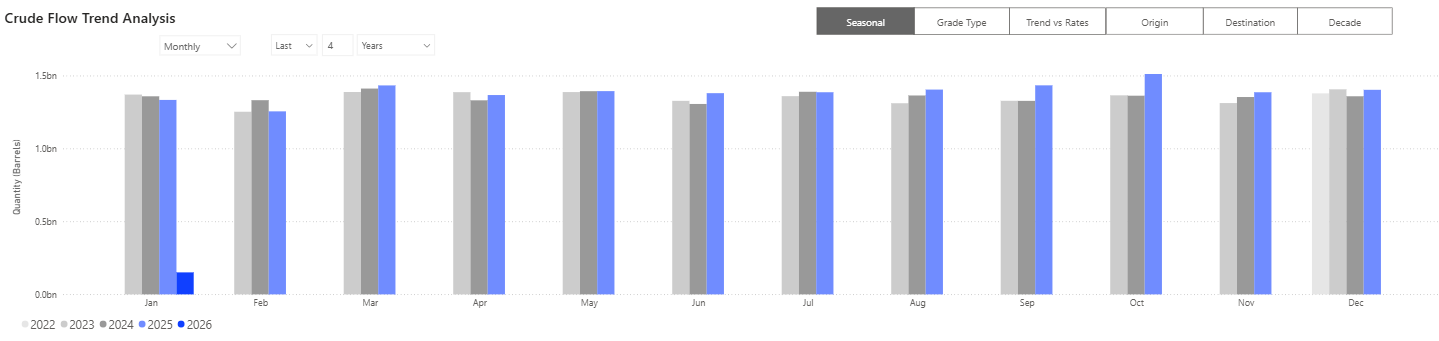 Monthly global crude flows show stable volumes with seasonal variation, indicating that changes in tanker demand are driven by routing, storage, and time at sea rather than step-change volume growth.
