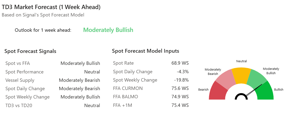 The TD3C spot rate has declined 19.8% WoW. Forward levels show clear premiums, with the current month FFA trading +6.7 WS, the balance of the month +6.0 WS, and the one-month forward contract +6.5 WS above the spot rate.