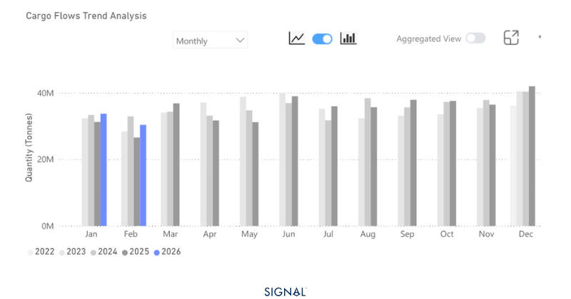 According to Signal Ocean, China imported 25mt of seaborne coal in February 2026, a 10% decrease from the previous year. This drove the global 1% fall in coal seaborne flows. There were pockets of growth, with India increasing seaborne coal flows by nearly 9% to 19 Mt in February.