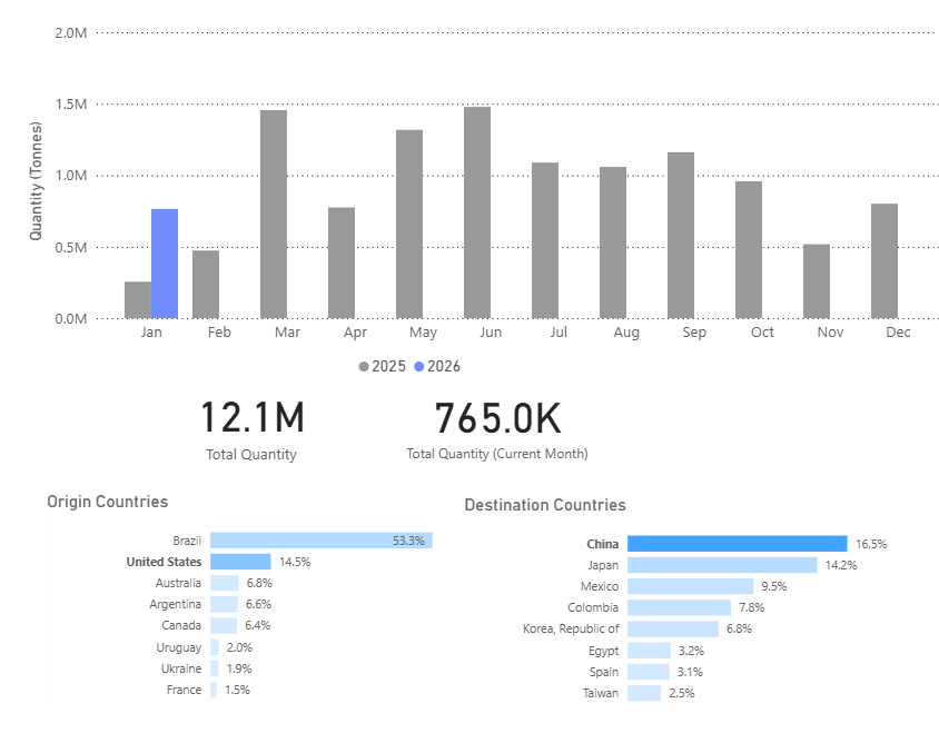 Brazil enters early 2026 with expanding export availability, reinforcing its role as China’s primary supplier.