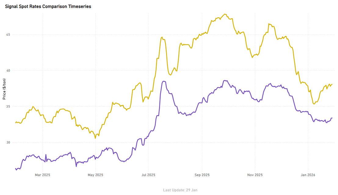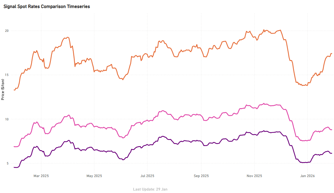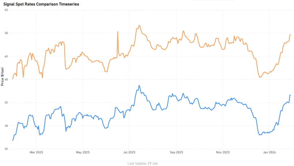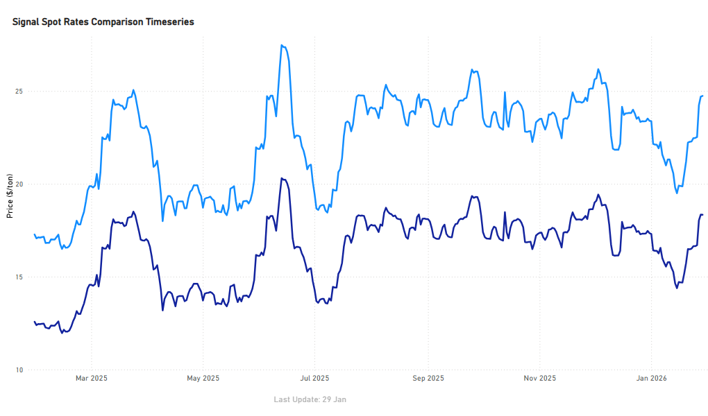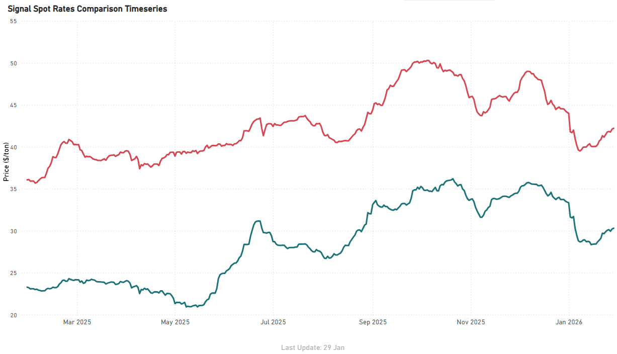 Atlantic Capesize routes firmed into the close of January, rebounding from mid-January lows, with Brazil–China recovering to around $24.7/tonne (≈+6–7% from mid-Jan troughs) and South Africa–China rising to about $18.3/tonne (≈+5–6%).