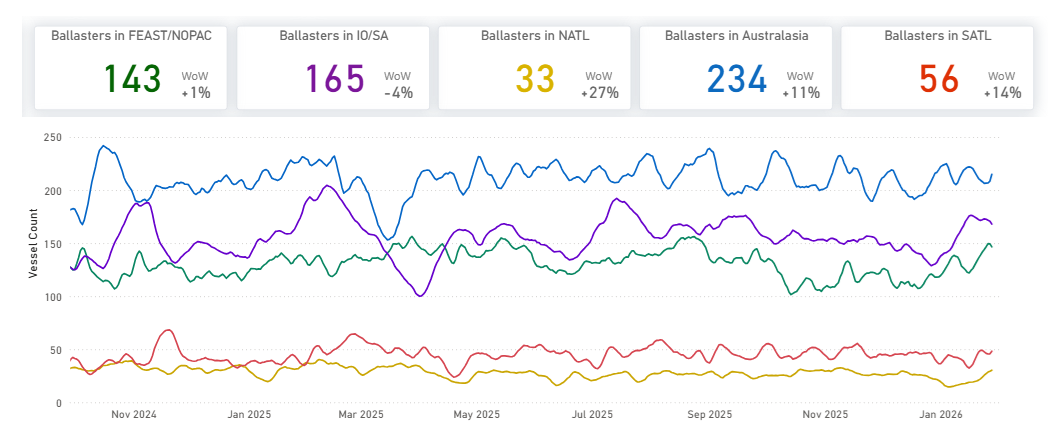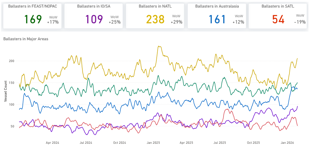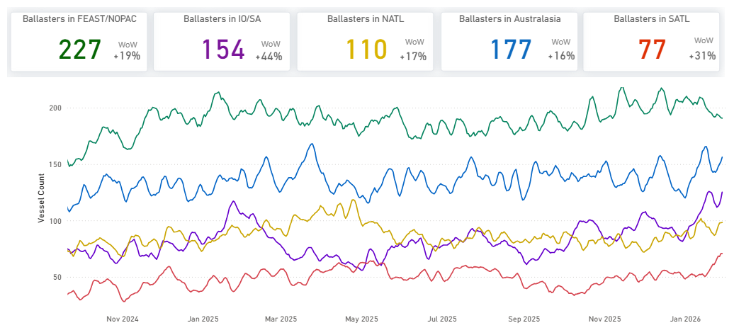 Supply pressure in the Pacific and Indian Ocean increased week-on-week. SE Asia/Australasia ballasters rose to 197 (+14% WoW), while Indian Ocean/South Africa ballasters climbed sharply to 225 (+18% WoW). FEAST/NOPAC ballasters stood at 166, remaining elevated despite an 8% WoW pullback.