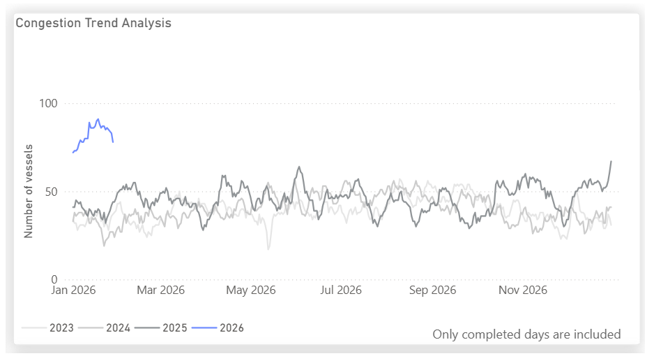 In January 2026, Chittagong experienced a notable increase in vessels anchored offshore, indicative of ongoing port congestion. This backlog aligns with recent news detailing slow discharge operations and limited unloading capacity, which have caused prolonged vessel turnaround times. The strain on berth and yard efficiency is evident, with sources indicating that importers are being pressed to clear cargo within a five-day window.