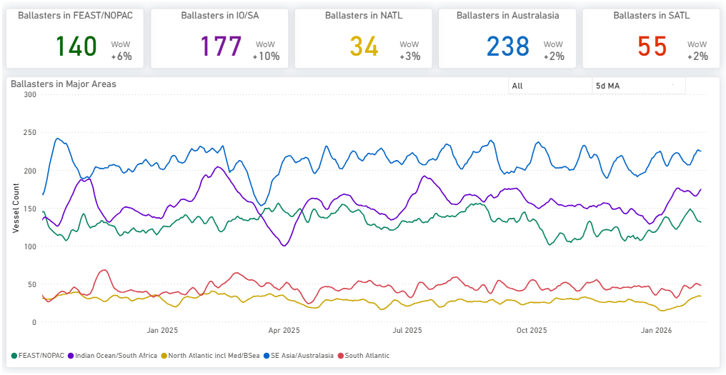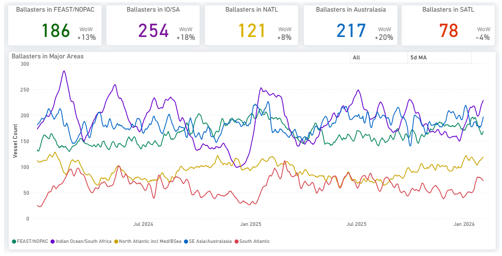 Rising Supply Pressure: Ballaster supply is increasing across most basins, particularly in the Pacific and Indian Ocean, indicating growing supply pressure.