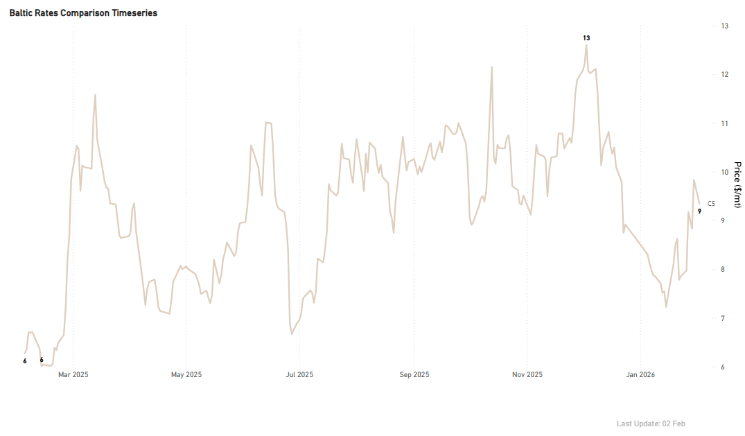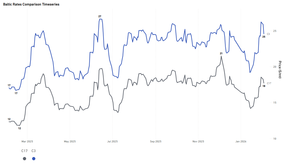 The Capesize market experienced a strong rally, with the Tubarao to Qingdao rate climbing to nearly $26/ton before easing to $25/ton, yet sentiment remains 44% firmer than a year ago. An upward trend is also mirrored in the Saldanha Bay-Qingdao route, where rates have edged up to $18/ton, though the route reached a higher peak of $20/ton in early December. February’s improved sentiment provides near-term support for Capesize prospects, though uncertainty around Chinese steel demand persists.
