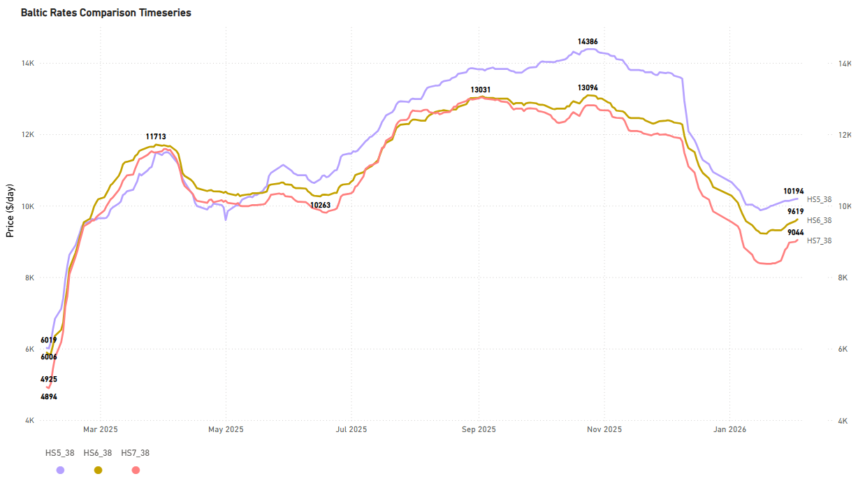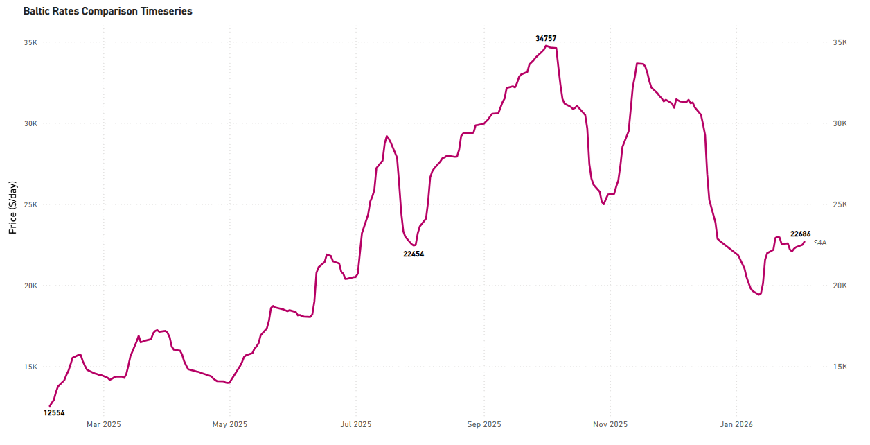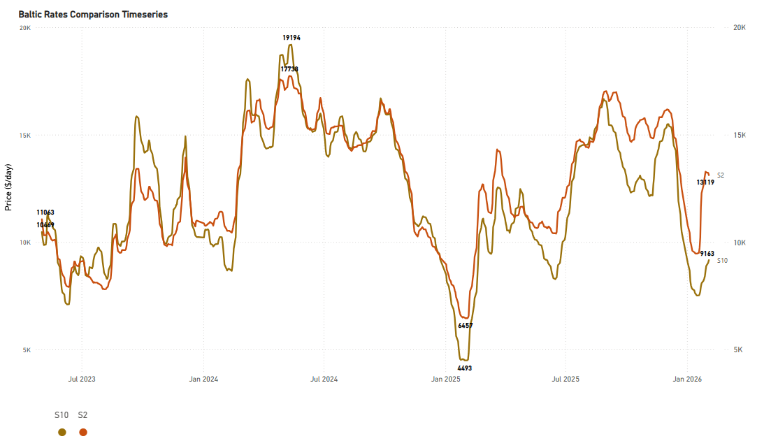 The Panamax Pacific market is currently experiencing exceptional gains, as evidenced by the P3A_82 route, which is now exceeding $14k/day. This represents a significant rebound from the very weak levels of approximately $9k/day seen before Christmas 2025.