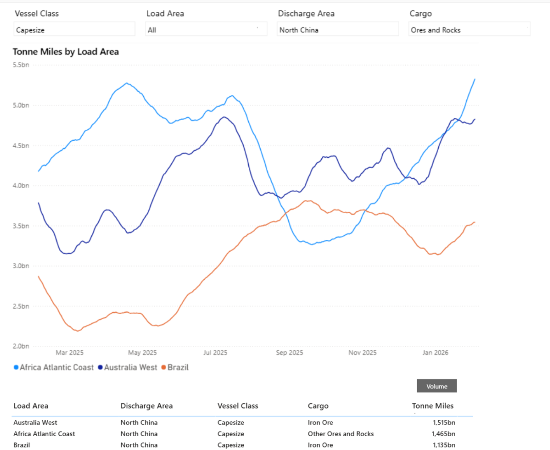 Higher Tonne-Mile Demand: Year-on-year tonne-mile demand has increased, with African–North China routes showing stronger growth than the Brazil–China routes.