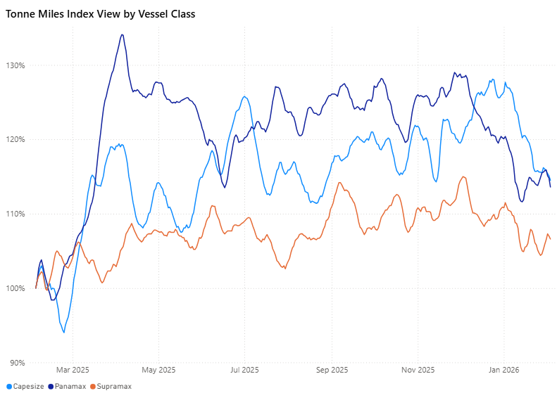 Metrics Description: Index View (Base 100) by total Tonne Miles over the selected period. This facilitates relative performance comparisons between segments of different sizes (e.g., comparing the growth rate of Supramax vs Capesize)