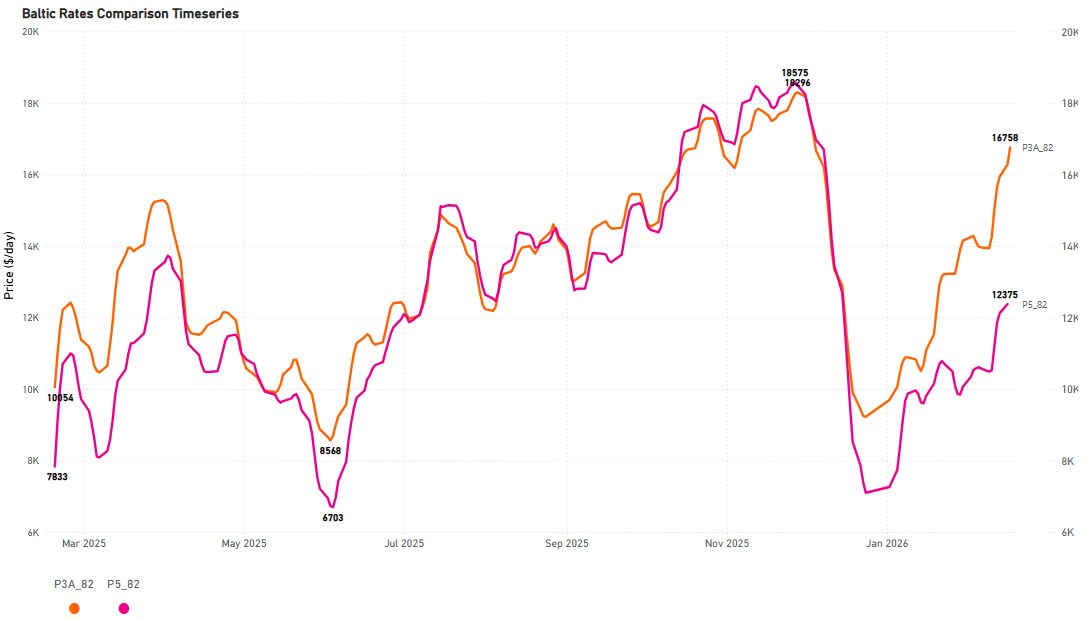 Capesize corrects but stays elevated; Panamax remains resilient, particularly on Atlantic grain routes.