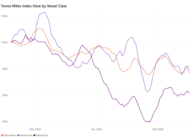 Metrics Description: Index View (Base 100) by total Tonne Miles over the selected period. This facilitates relative performance comparisons between segments of different sizes (e.g., comparing the growth rate of Supramax vs Capesize)