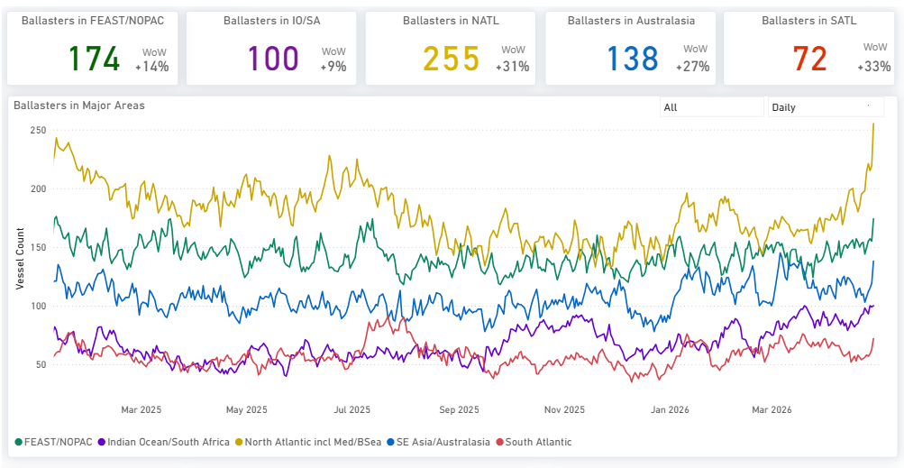 Handysize: Ballasters are surging in the Atlantic and Pacific, with NATL and SATL leading at +31% and +33% WoW. The Indian Ocean is growing at a more measured pace of +9%.